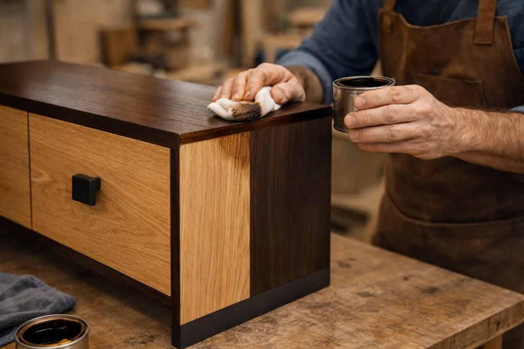 Étape cruciale pour la protection et l’aspect visuel, j’applique les huiles, vernis ou cires qui viendront sublimer le veinage naturel du bois.