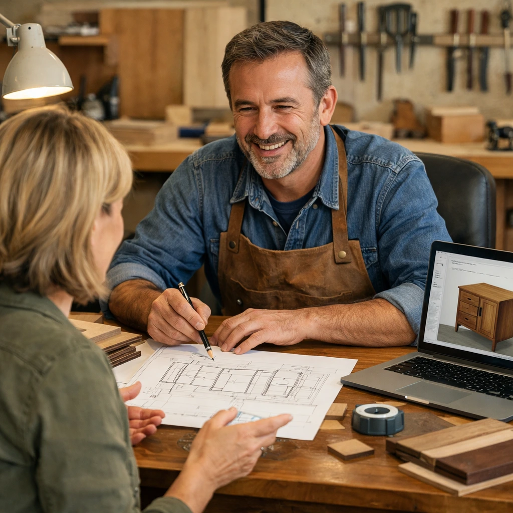 Je traduis nos échanges en dessins et plans techniques pour valider ensemble les proportions et l’esthétique avant le premier coup de scie.